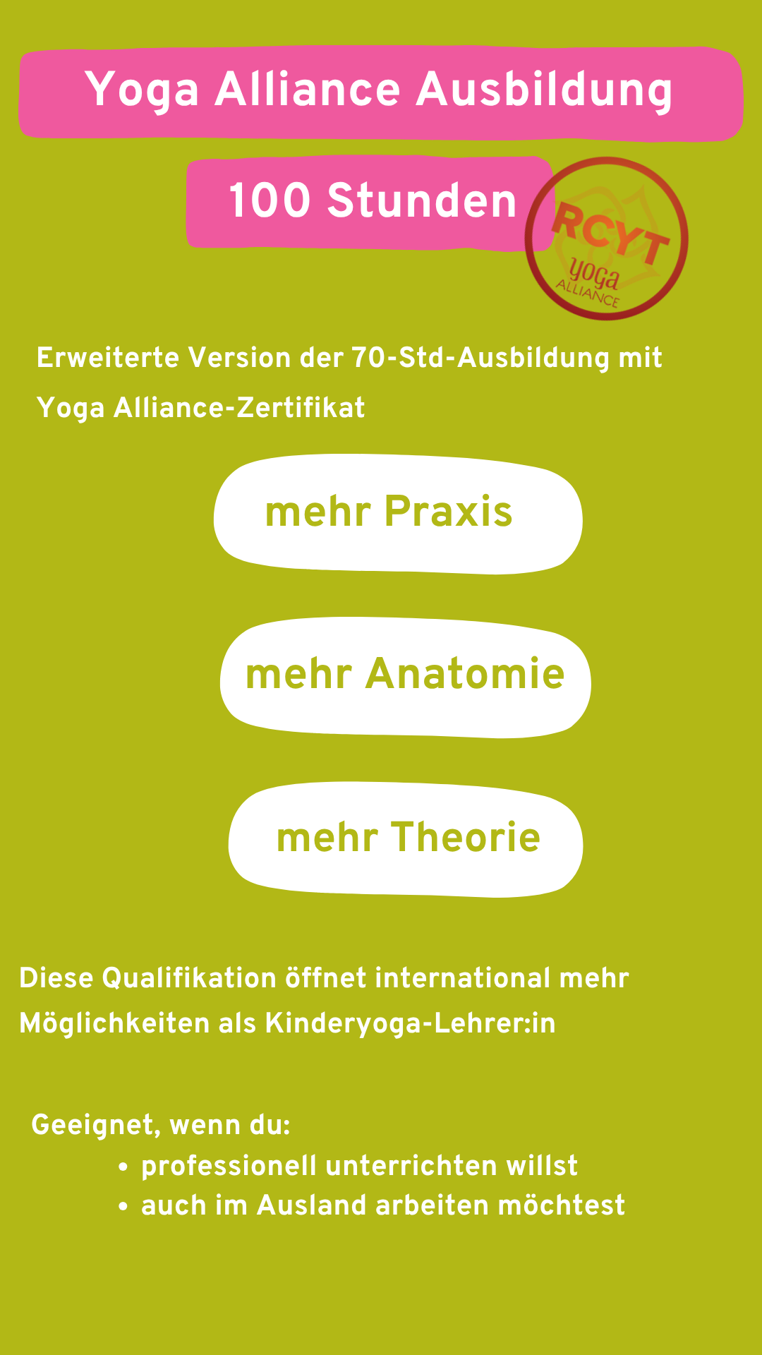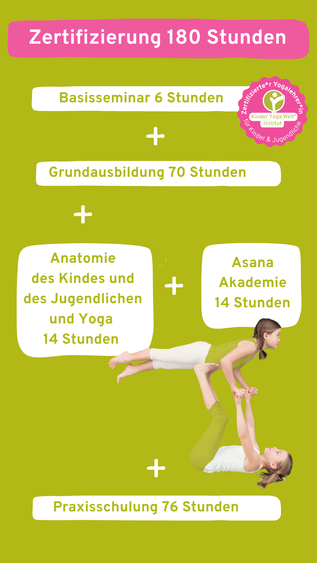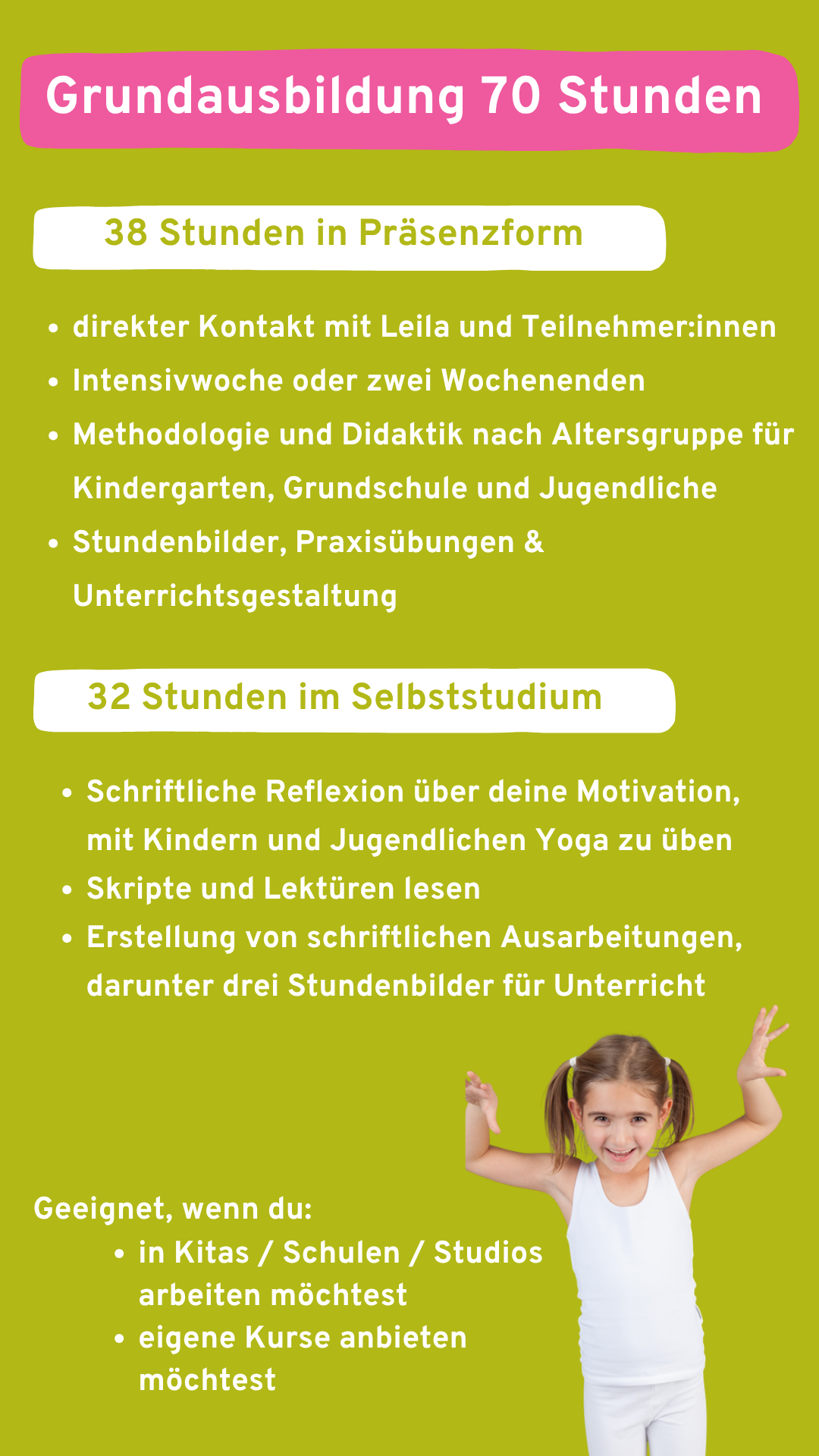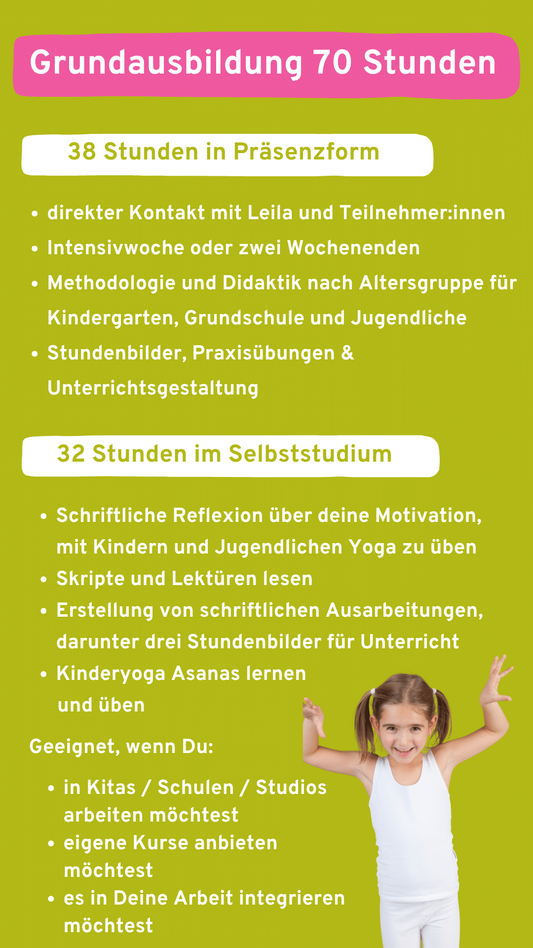 Mit unserem einzigartigen Konzept wirst Du Teil einer Bewegung, die Kinder und Jugendliche dabei unterstützt, achtsam, stark und voller Selbstvertrauen durchs Leben zu gehen. Diese Ausbildung verbindet Yoga-Tradition, kulturelle Vielfalt und wissenschaftlich fundiertes Wissen zu einem ganzheitlichen Ansatz, der genau auf die Bedürfnisse junger Menschen abgestimmt ist.